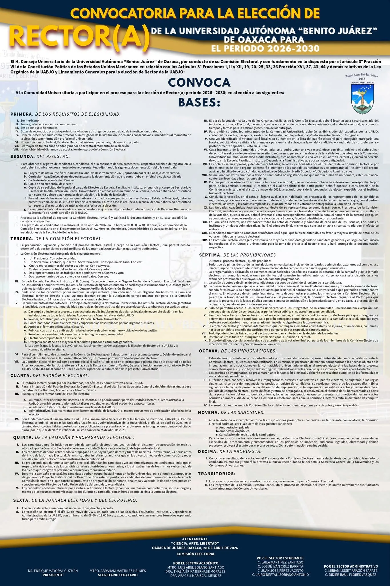 Oaxaca, Oax.- El próximo 30 de abril será el registro de candidatos para la rectoría de la Universidad Autónoma Benito Juárez de Oaxaca (UABJO).
