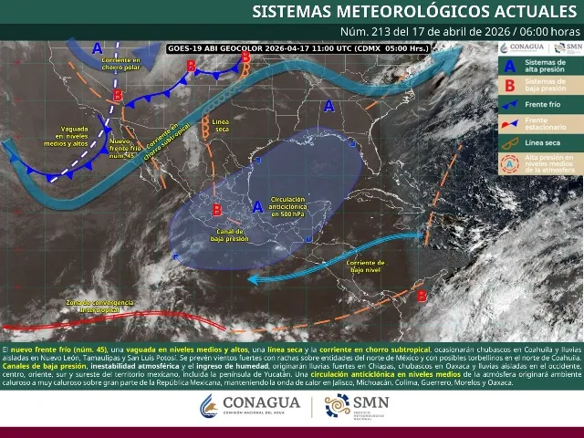 Finalmente, el frente frío número 45 se extenderá junto con una vaguada sobre el noroeste de la República Mexicana.